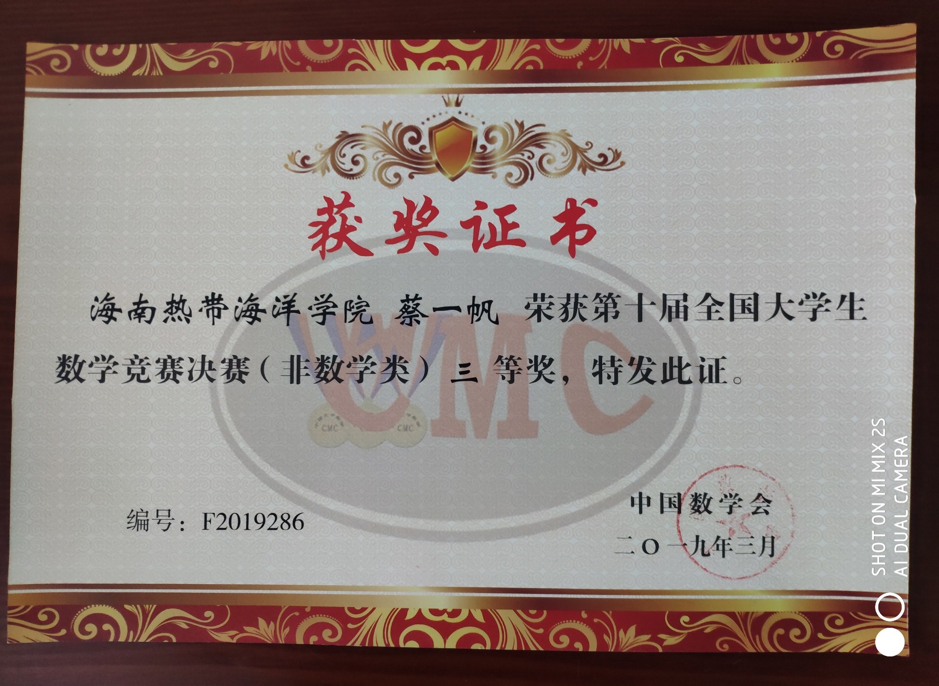 2019年3月30日的第十届全国大学生数学竞赛,在哈尔滨工业大学举行。我校海洋信息工程学院2015级船舶电子学生的蔡一帆喜获非数学专业组三等奖。